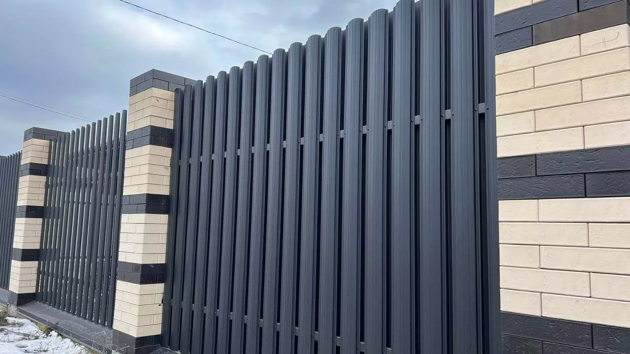 Монтаж листов осуществляется на металлический каркас с помощью кровельных саморезов с уплотнительными шайбами, что обеспечивает надежное и герметичное крепление. Для завершенного внешнего вида верхнюю часть забора закрывают декоративной планкой или уголком в цвет покрытия, либо используют контрастные элементы для создания более выразительного дизайна.